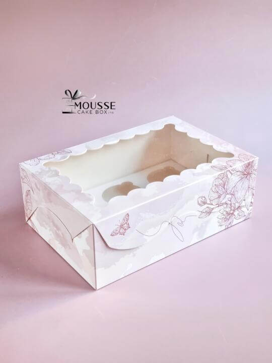 Stylish and patterned cupcake box, sturdy and secure for 6 cupcakes, top window helps you to demo your creations.