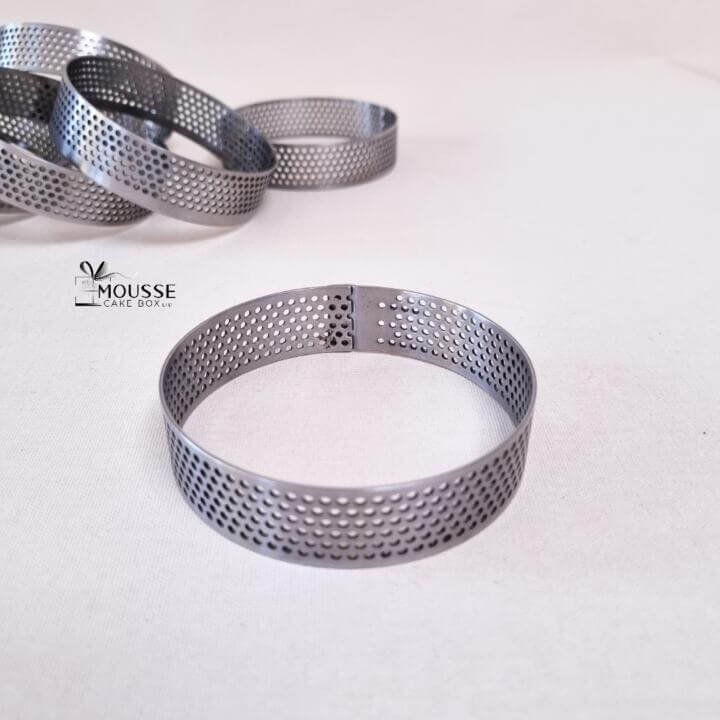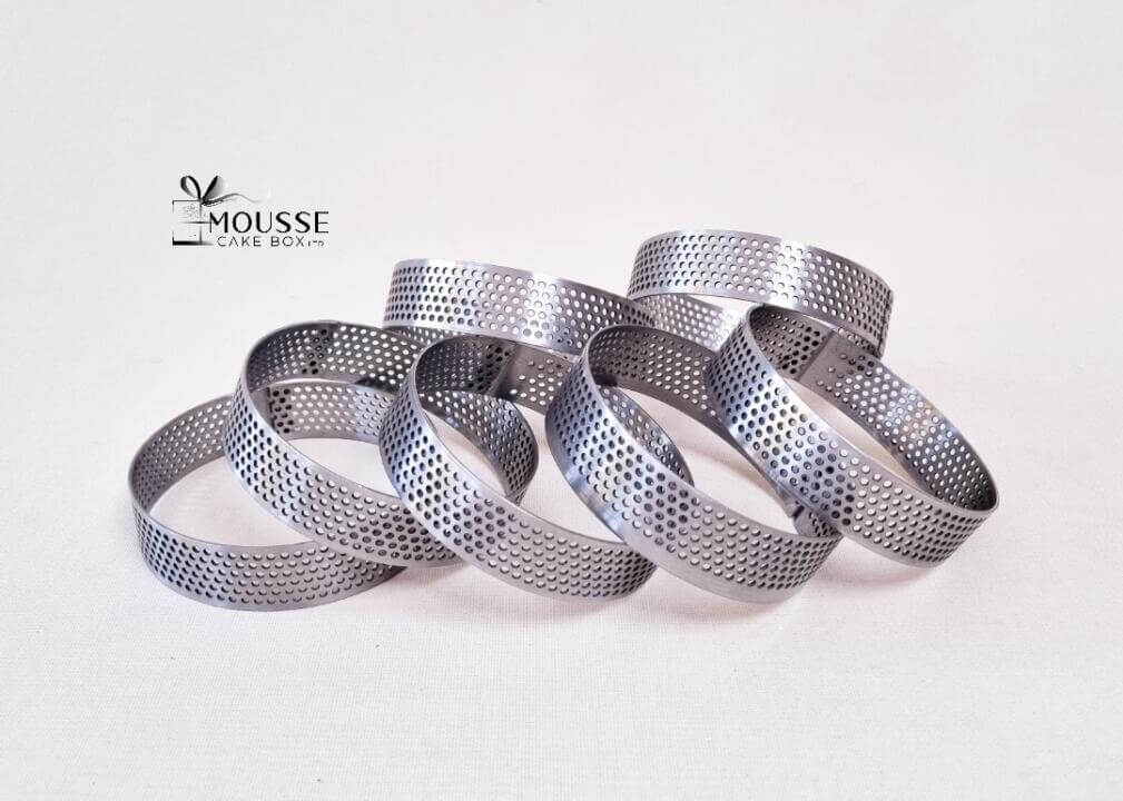 Perforated mini tarts rings sturdy stainless steel diameter 8cm high 2cm. Suitable for the preparation tarts.